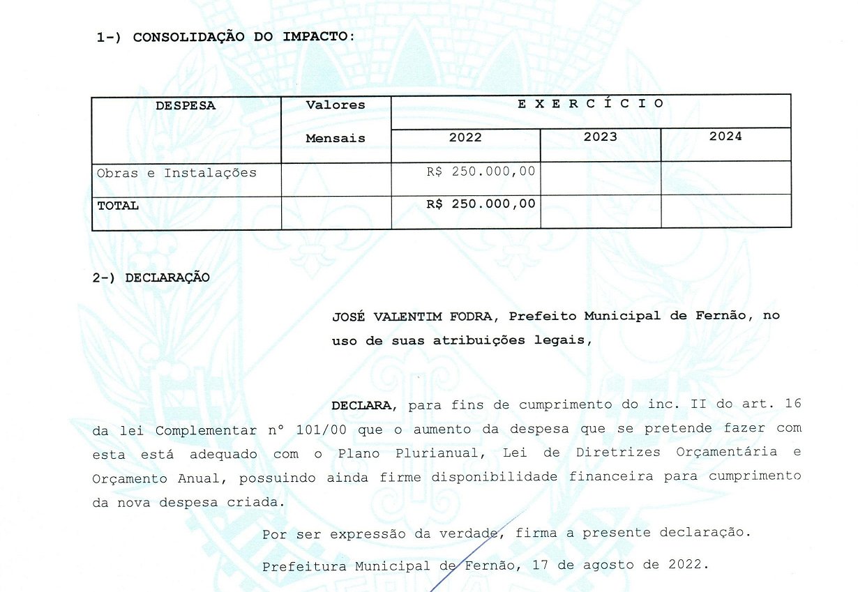 JOSÉ VALENTIM FODRA, PREFEITO MUNICIPAL DE FERNÃO, ESTADO DE SÃO PAULO, NO USO DE SUAS ATRIBUIÇÕES LEGAIS,