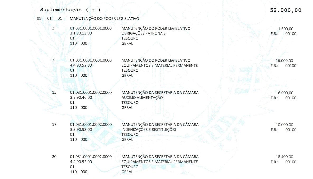 Lei 4.320/64 Crédito Adicional Suplementar, no valor de R$ 52.000,00 (cinqüenta e dois mil reais) para suplementação da seguinte dotação orçamentária:
