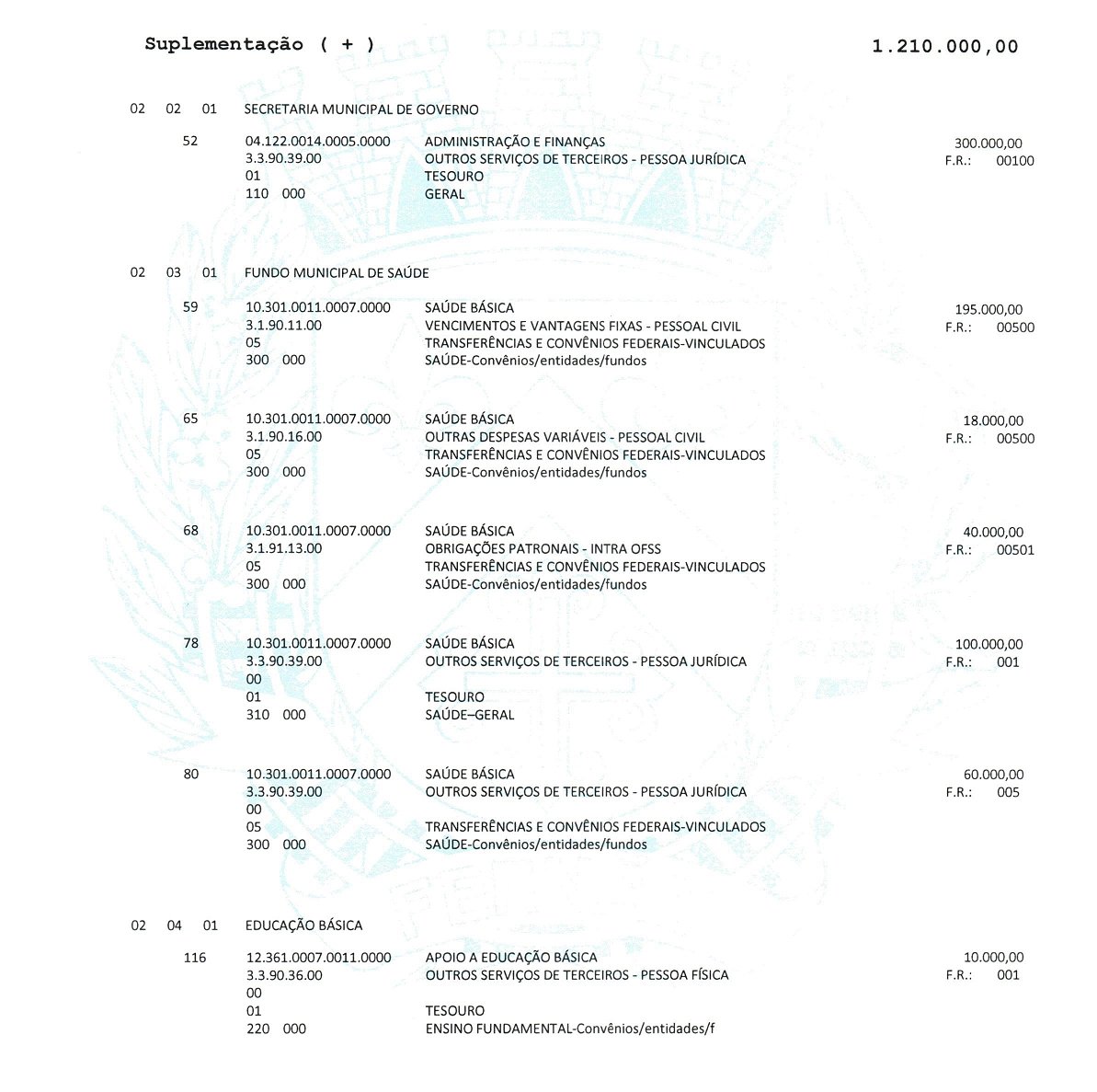 da Lei 4.320/64 Crédito Adicional Suplementar, no valor de R$ 1.210.000,00 (um milhão duzentos e dez mil reais) para suplementação das seguintes dotações orçamentárias: