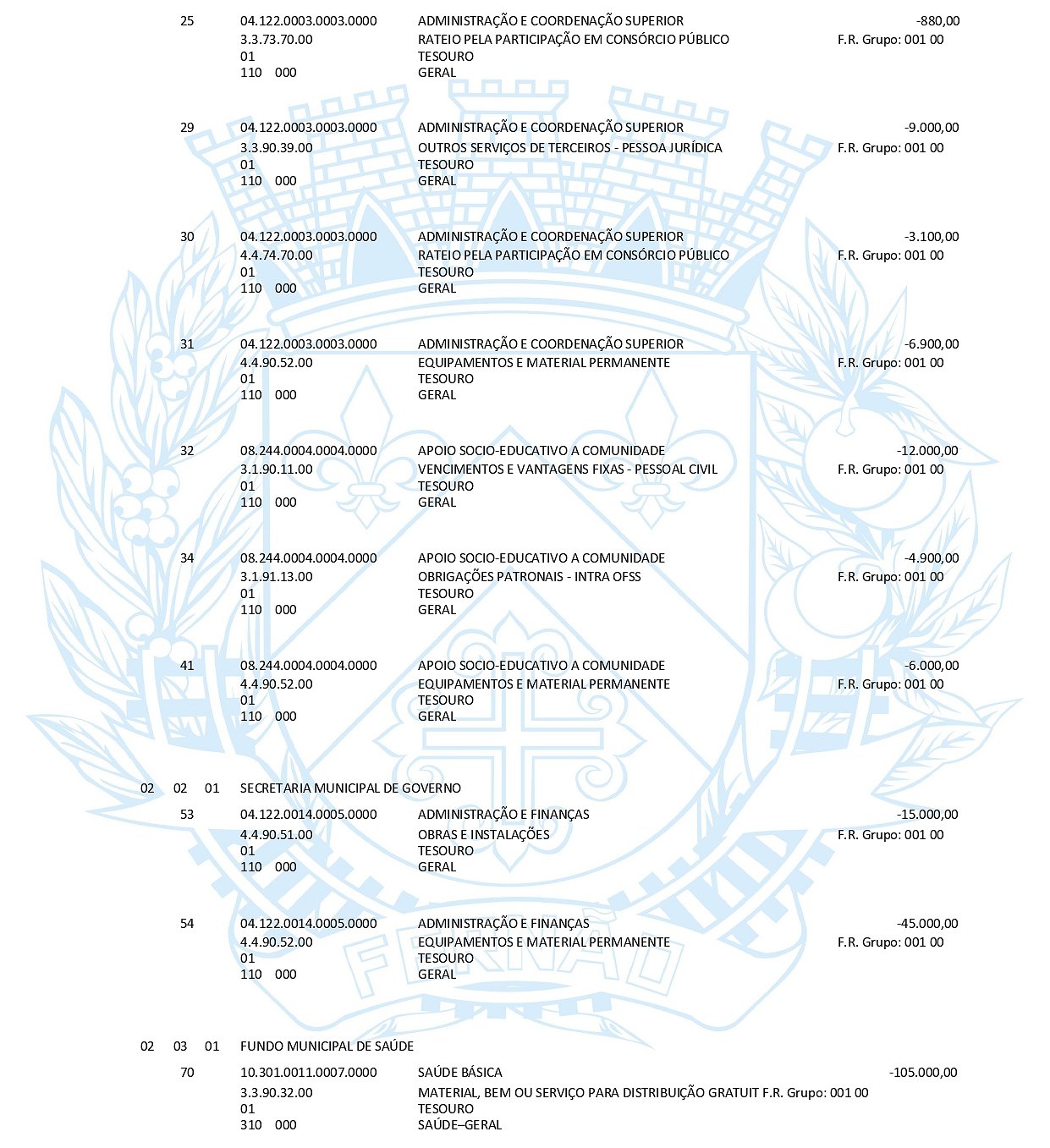 O Poder Executivo Municipal fica autorizado a abrir no orçamento - programa do exercício de 2025, nos termos do inciso I do art. 41 da Lei 4.320/64 Crédito Adicional Suplementar, no valor de R$ 561.000,00 (quinhentos e sessenta e um mil reais) para suplementação das seguintes dotações orçamentárias: