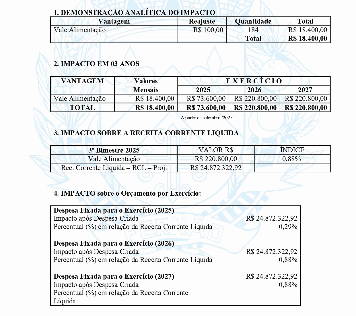 O valor do vale alimentação previsto no § 2º da Lei n.º 700 de 21 de novembro de 2013 sofrerá um acréscimo de R$ 100,00 (cem reais), passando dos atuais 1028,00 (mil e vinte e oito reais) conforme Decreto n.º 1571 de 13 de setembro de 2024 para R$ 1.128,00 (mil cento e vinte e oito reais), sendo 5,27% (cinco inteiros e vinte e sete centésimos por cento) a reposição prevista no art. 5º da Lei Municipal n.º 700 correspondente aos meses de agosto de 2024 a julho de 2025, acrescido de um ganho real de 4,46% (quatro inteiros e quarenta e seis centésimos por cento).