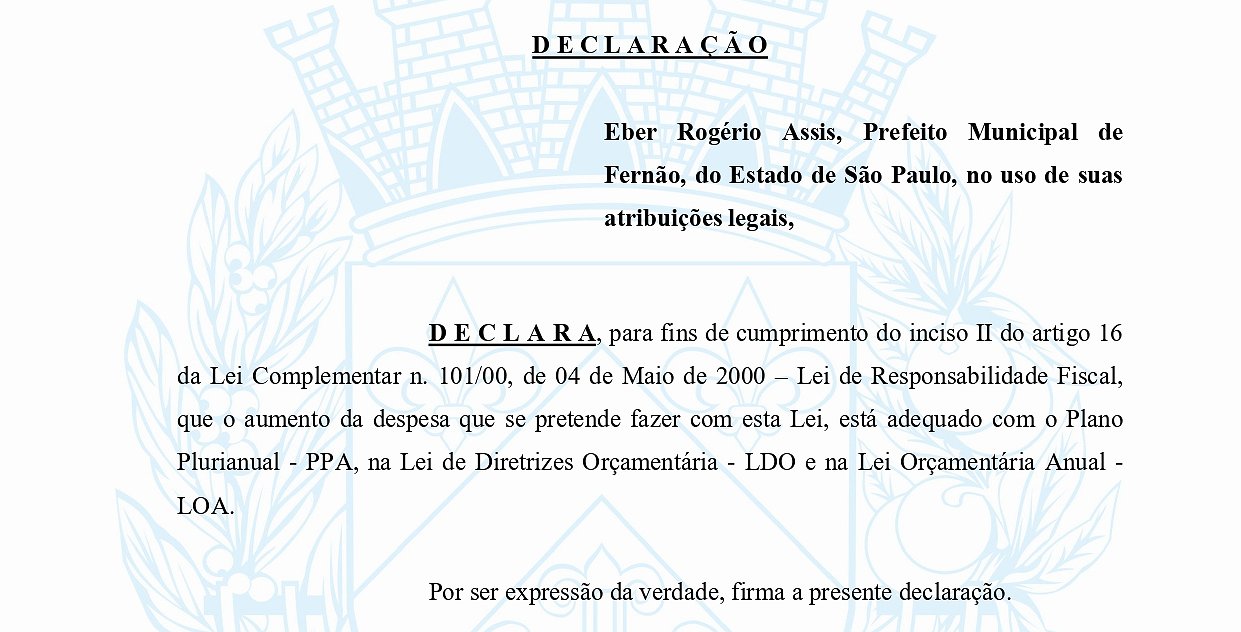 EBER ROGÉRIO ASSIS, PREFEITO DO MUNICÍPIO DE FERNÃO, ESTADO DE SÃO PAULO, NO USO DE SUAS ATRIBUIÇÕES LEGAIS.